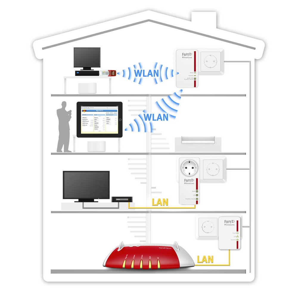 Fritzpowerline wlan set 1260e1220e 1260e. Powerline 1260e WLAN Set Inhalt. So erhalten PC und Fernseher eine rasante Datenleitung über die Stromleitung und Smartphone und Co surfen mit.
